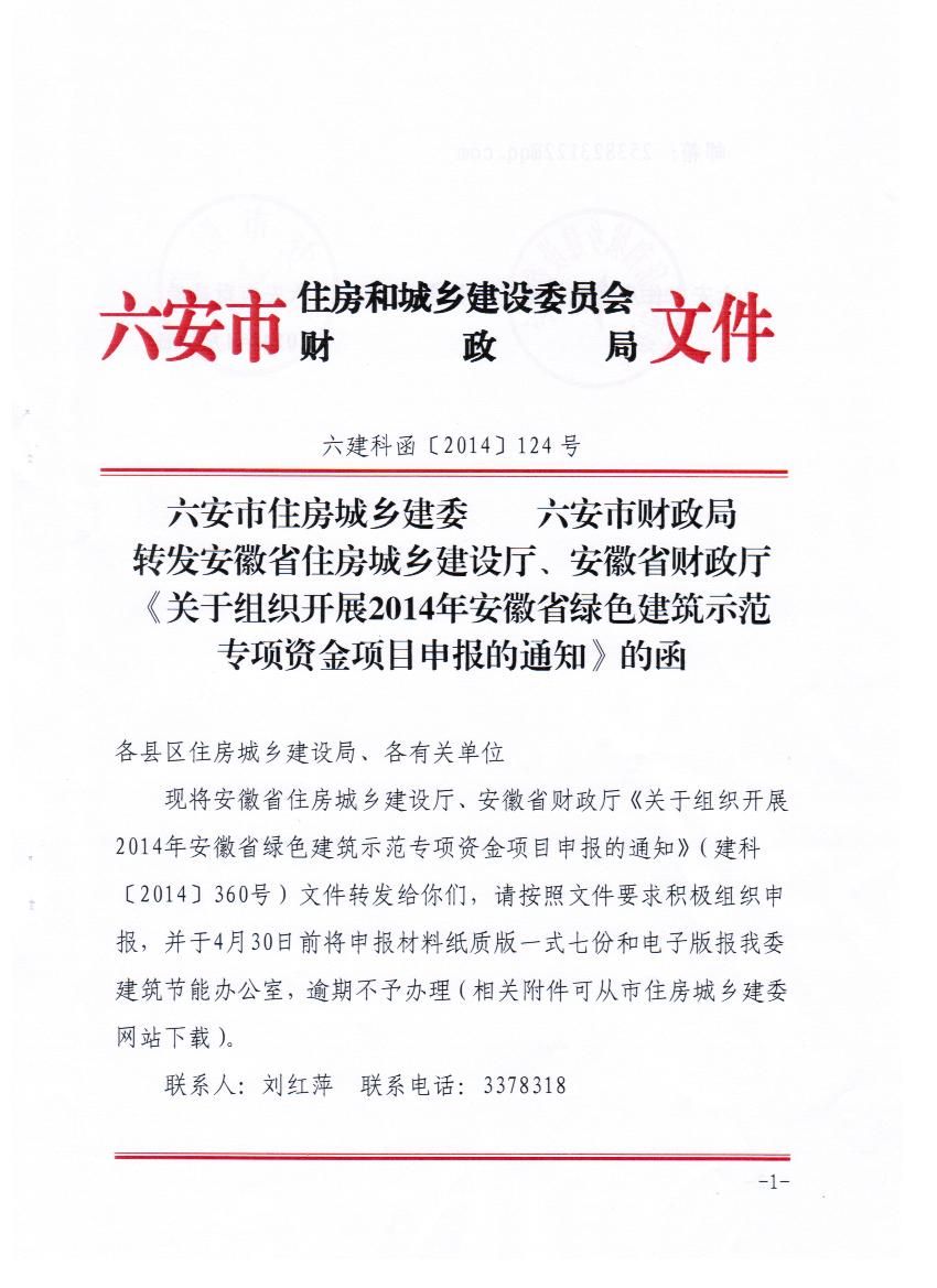 安徽省住房城乡建设厅+省财政厅关于组织开展2014年安徽省绿色建筑示范专项资金项目申报的通知.pdf