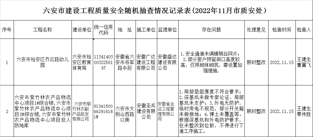 六安市建设工程质量安全随机抽查情况记录表(2022年11月市质安处)
