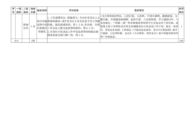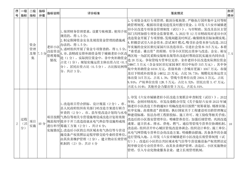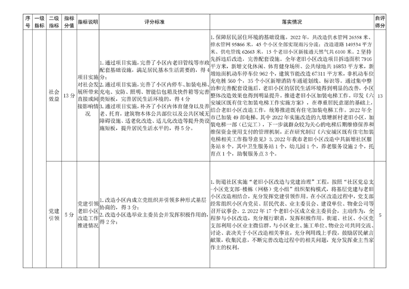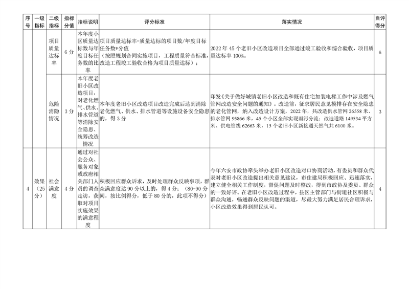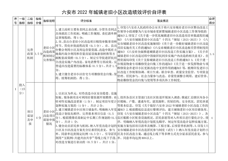 根据《关于做好城镇老旧小区改造考核激励工作的通知》要求,对照老旧小区改造绩效考核表,我局认真对六安市2022年度城镇老旧小区改造工作进行自评,自评得分为100分。现将具体情况报告如下: