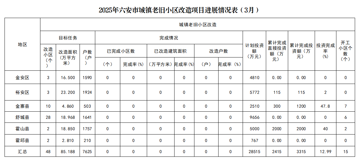 2025年六安市城镇老旧小区改造项目进展情况表(3月)