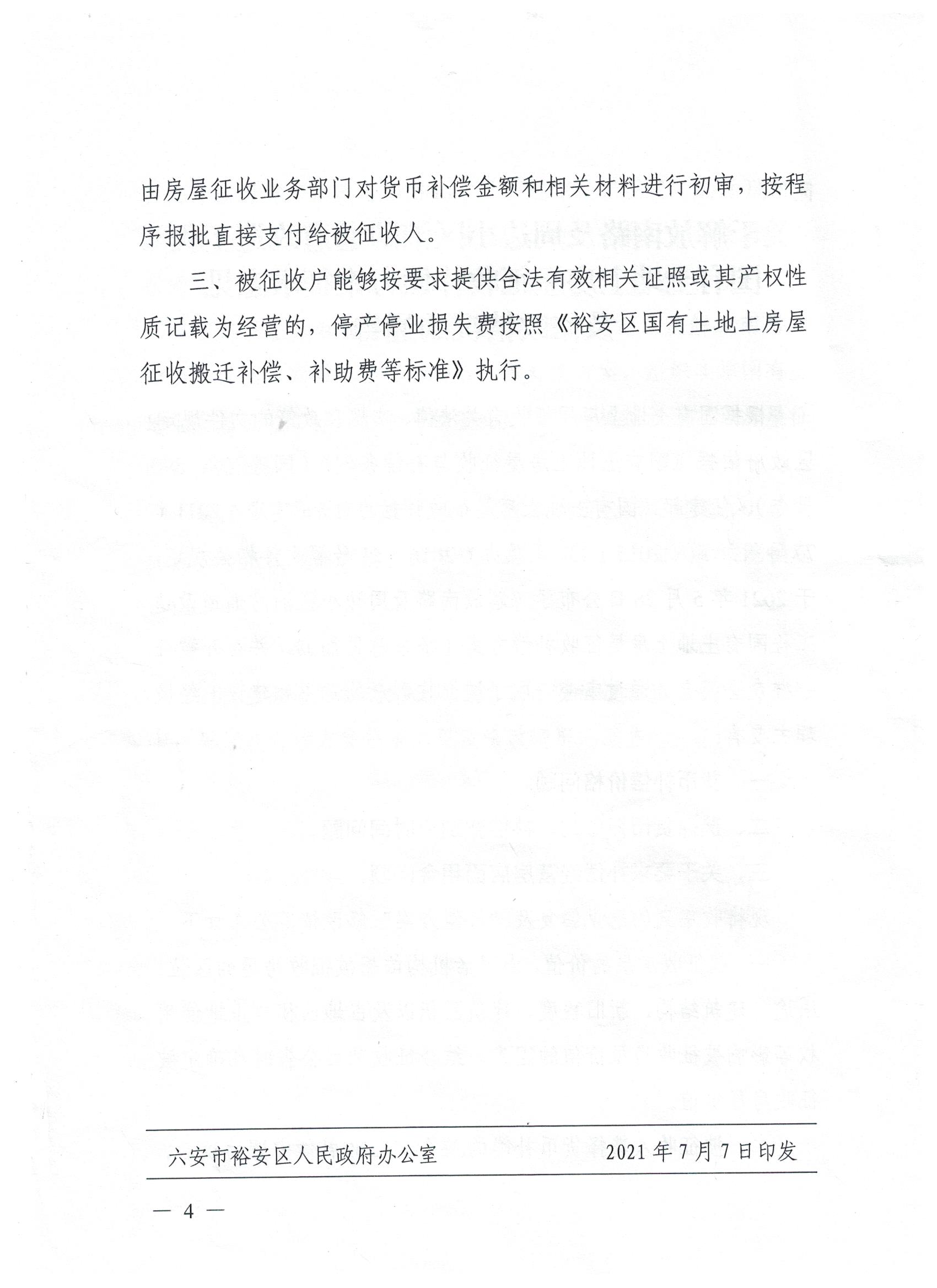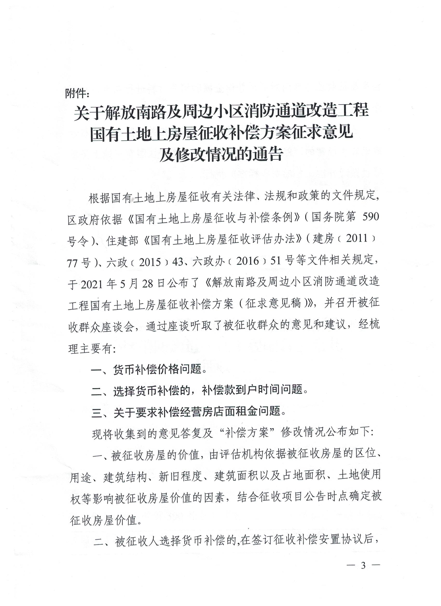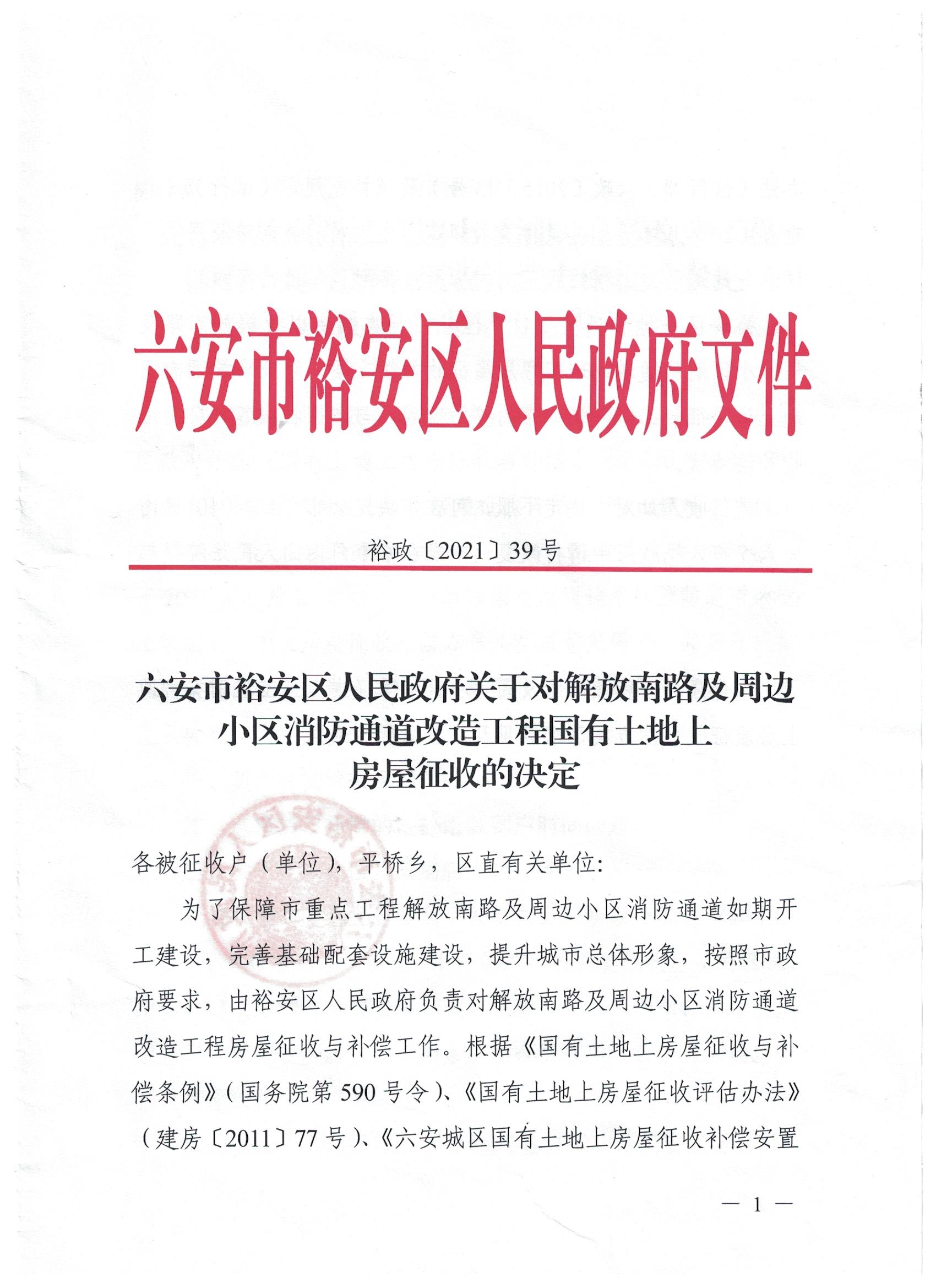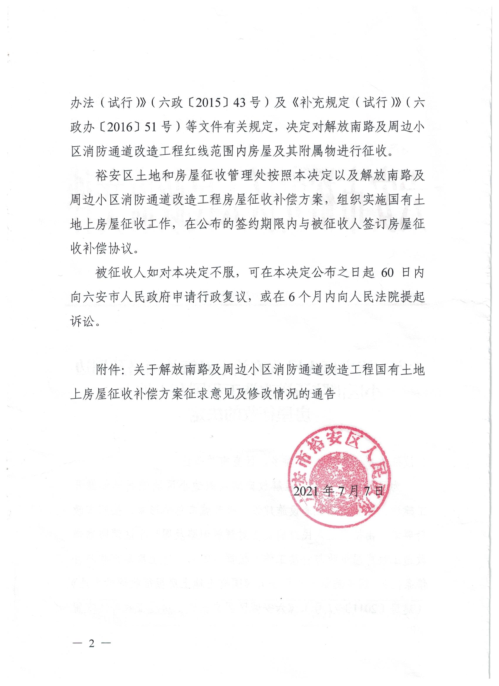 六安市裕安区人民政府关于对解放南路及周边小区消防通道改造工程国有土地上房屋征收的决定