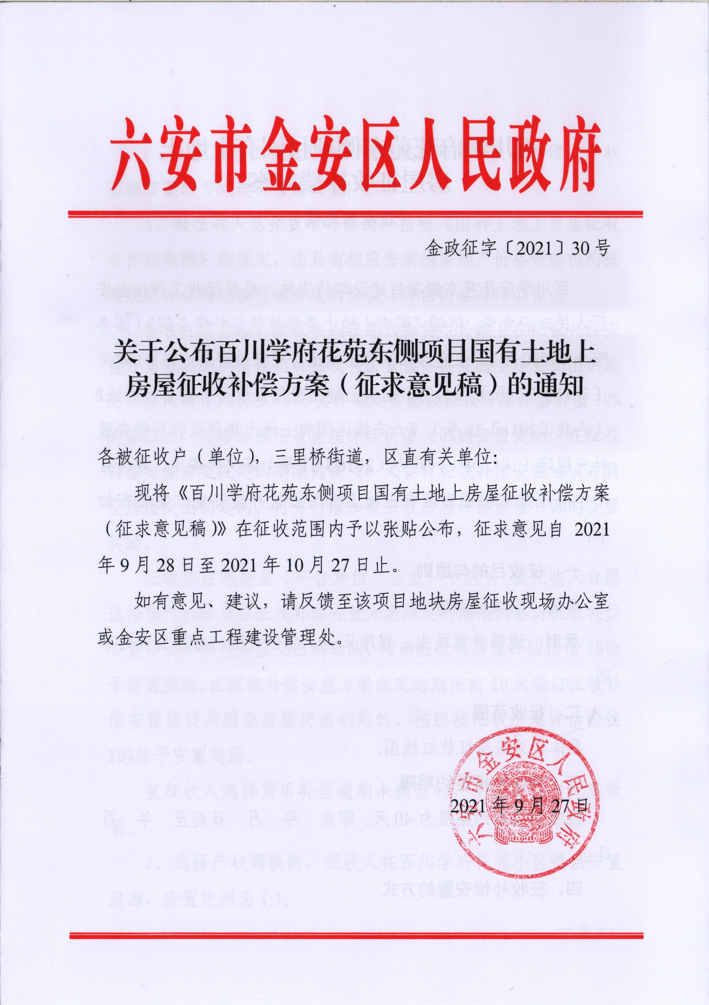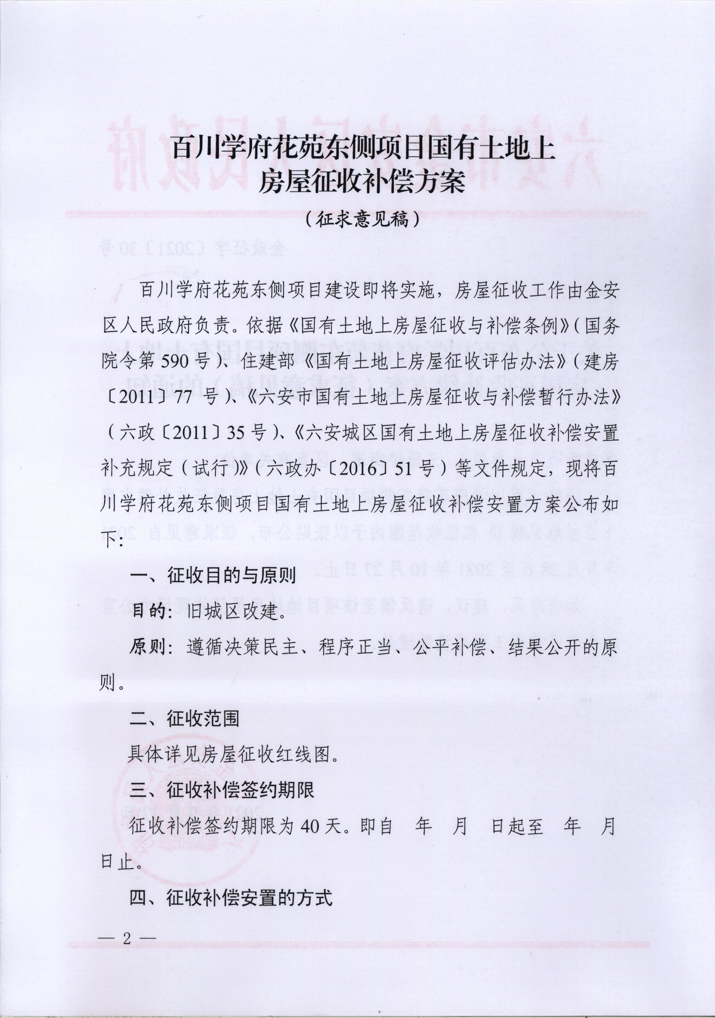 关于公布百川学府花苑东侧项目国有土地上房屋征收补偿方案(征求意见稿)的通知