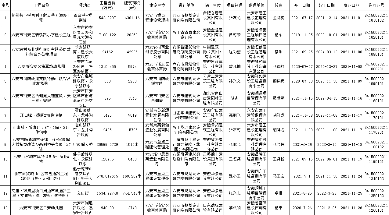 六安市建筑工程施工许可证发放登记表(2021年11月)