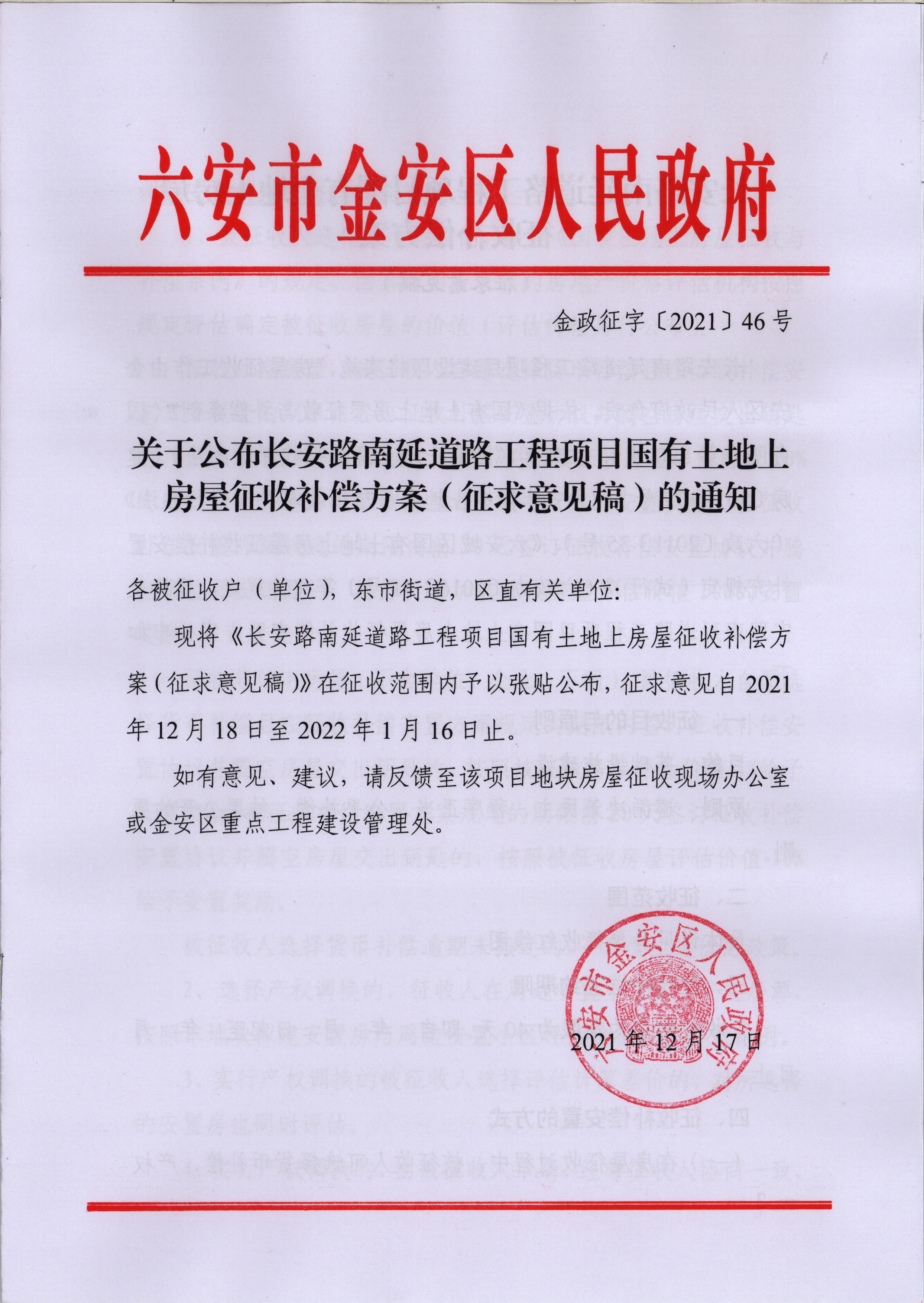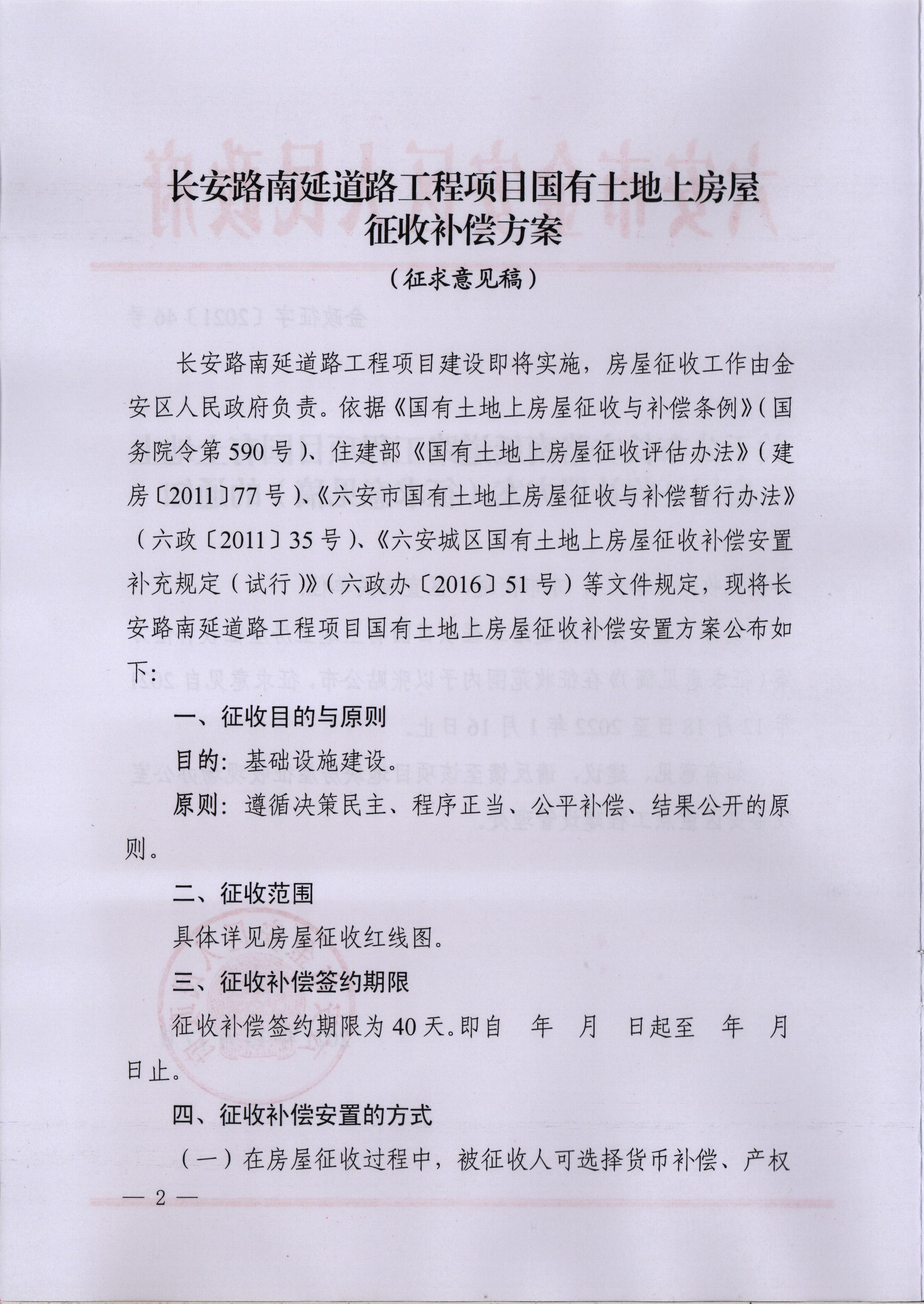 关于公布长安路南延道路工程项目国有土地上房屋征收补偿方案(征求意见稿)的通知