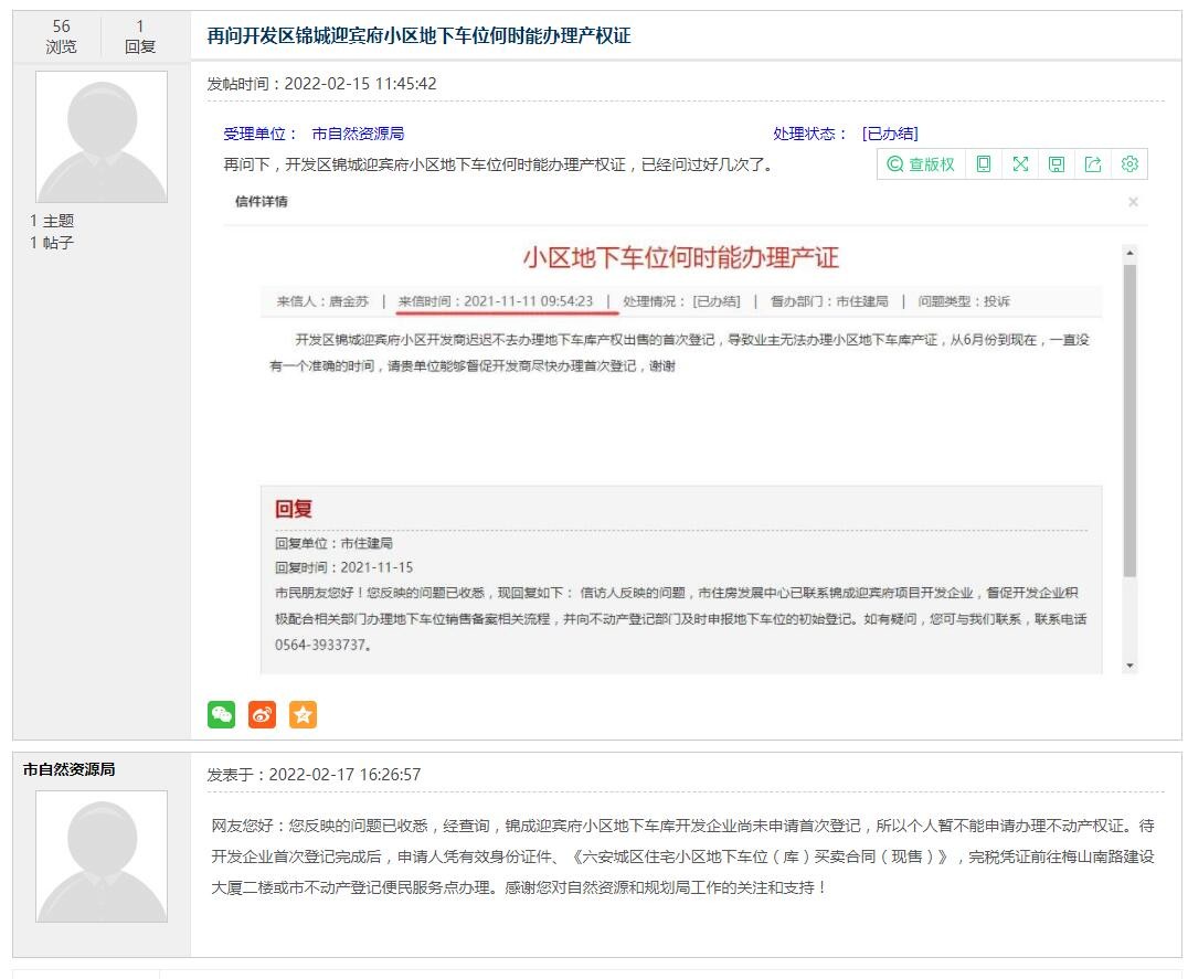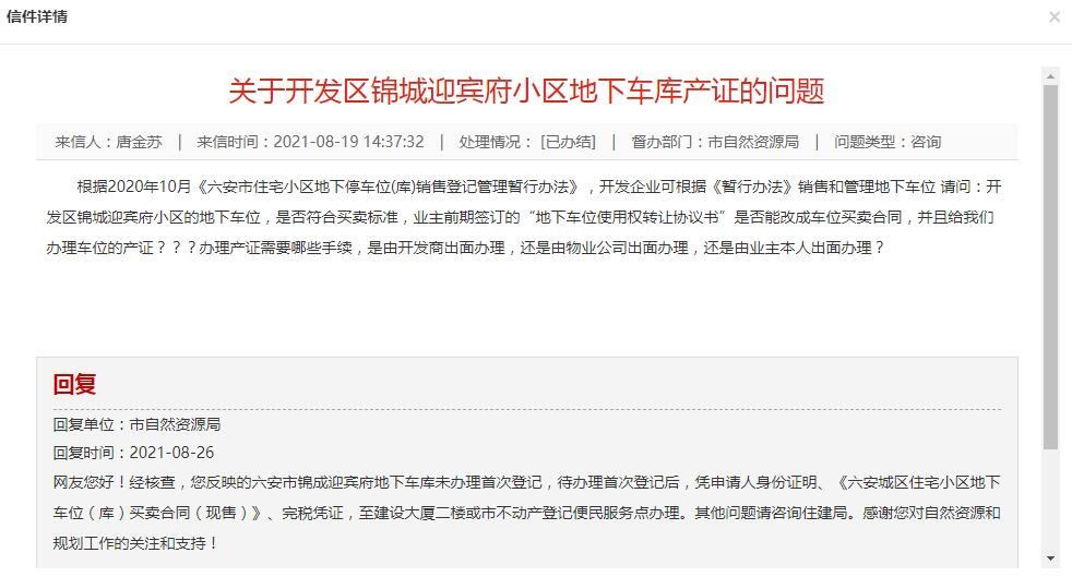 信访人反映的问题,市住建局已经联系锦城迎宾府项目开发企业,督促开发企业按照《六安城区住宅小区地下停车位(库)销售登记管理暂行办法》相关要求,办理地下车位的不动产权证,协助业主办理地下车位不动产权证。如有疑问,您可与市住建局联系,联系电话0564-3933737。
