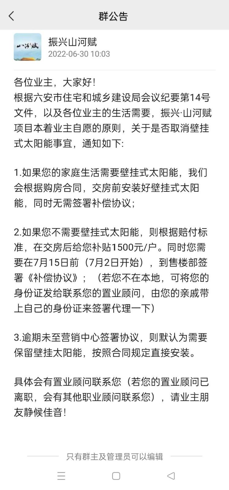 近期,本人接到振兴山河赋《关于是否取消壁挂式太阳能事宜的通知》,通知中提到了此事根据六安市住房和城乡建设局会议纪要第14号文件精神,对于取消壁挂式太阳能,根据赔付标准,在交房后给补贴1500元/户,具体文件内容开发商没有告知业主,太阳能热水器的品牌型号是什么暂不知情,对此很多业主产生了疑虑,这个赔付标准依据和标准是什么(没有具体化),是否应该把文件及设备型号以清晰明了的形式告知全体业主看后再做是否自愿取消的决定?