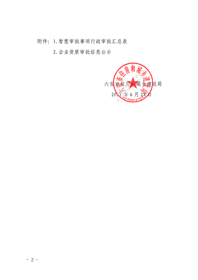 六安市住房和城乡建设局关于2021年第十五批智慧审批事项行政审批结果的公告