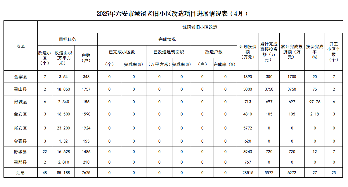 2025年六安市城镇老旧小区改造项目进展情况表(4月)