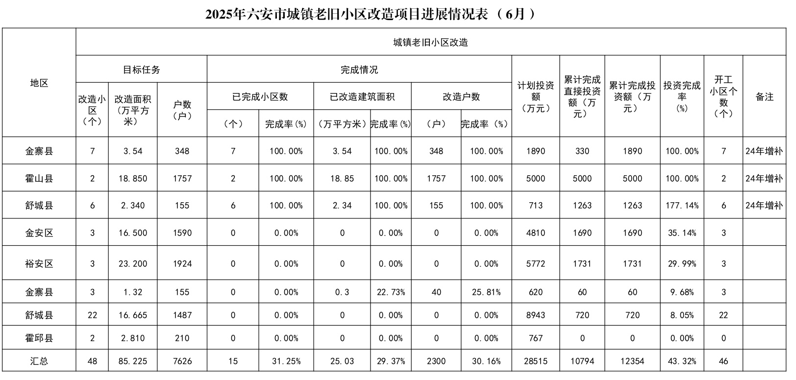 2025年六安市城镇老旧小区改造项目进展情况表(6月)