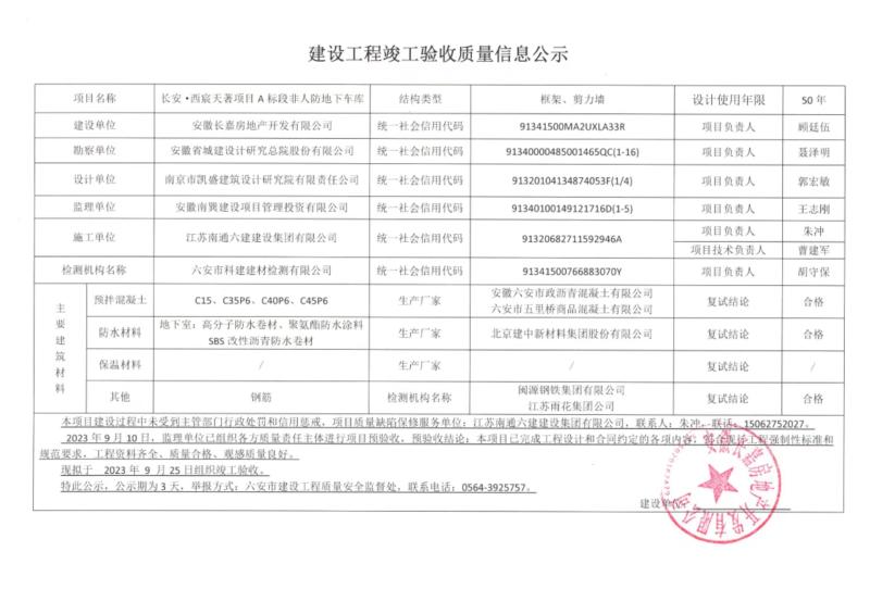 关于长安•西宸天著项目A标段非人防地下车库竣工验收的公示