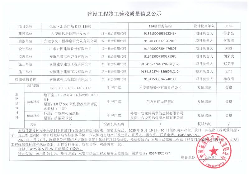 关于恒远·汇金广场D区18#楼竣工验收的公示