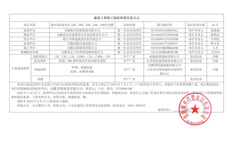 关于振兴·溪境东区24#、29#、30#、34#、35#住宅楼竣工竣工验收的公示