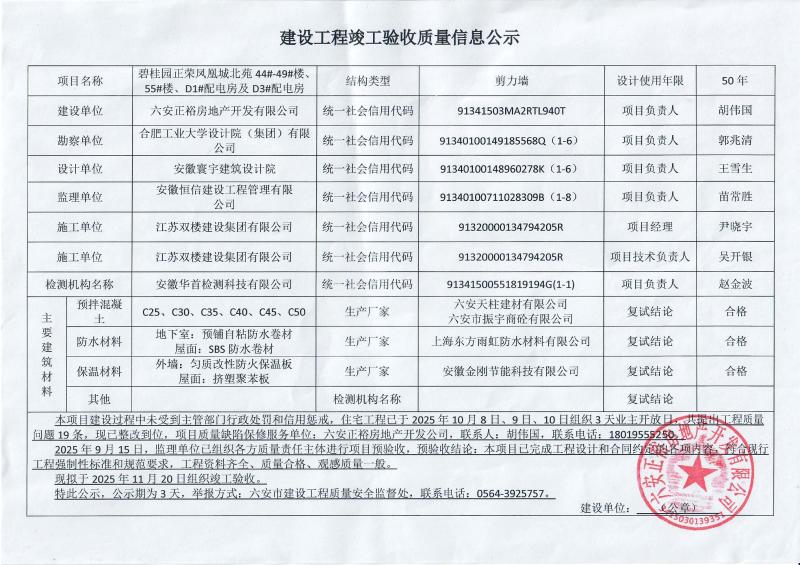 关于碧桂园正荣凤凰城北苑44#~49#楼、55#楼、D1#配电房及D3#配电房竣工验收的公示