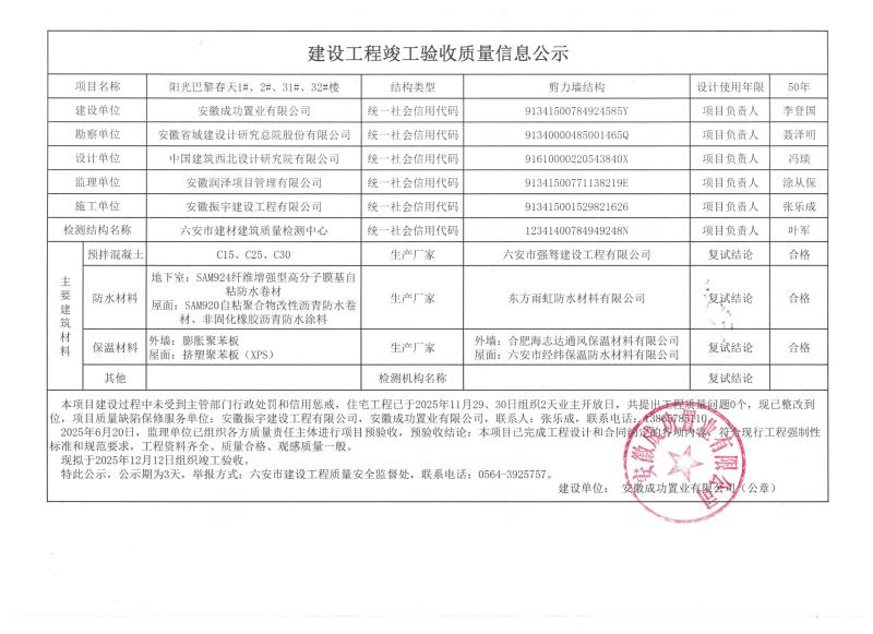 关于阳光巴黎春天1#、2#、31#、32#住宅楼竣工验收的公示