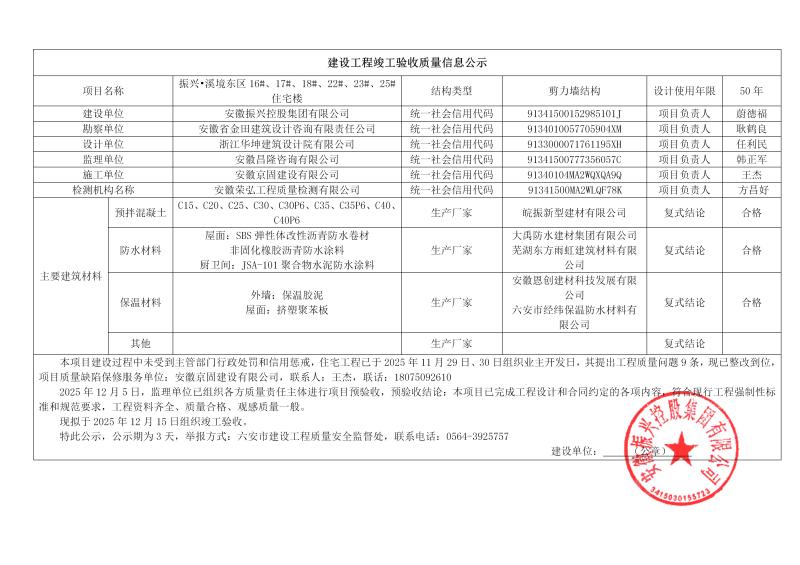 关于振兴·溪境东区16#、17#、18#、22#、23#、25#住宅楼竣工验收的公示