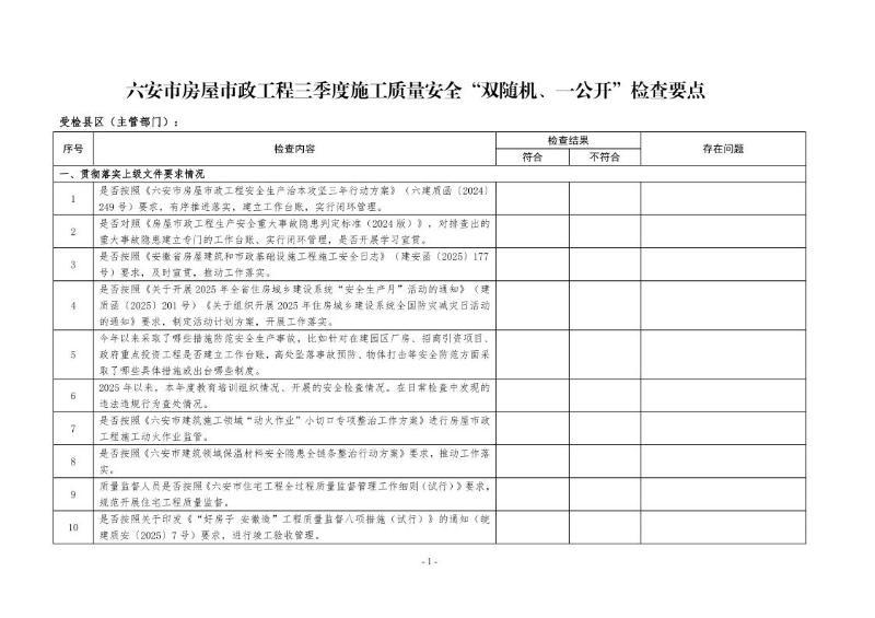 根据《关于开展六安市住房和城乡建设局 2025 年度 “双随机、一公开”抽查工作的通知》(六建法函〔2025〕260 号),经研究,决定组织开展 2025 年三季度全市房屋市政工程施工质量安全 “双随机、一公开”综合检查。现将有关事项通知如下: