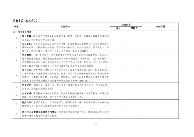 (一)检查范围:全市在建房屋建筑主体结构、装饰装修、建筑电气、通风与空调等各分部工程阶段和市政基础设施结构层施工阶段项目,在项目库中随机抽取检查项目,市直管工程抽查比例不少于 10%,各县区抽查不少于 2 个项目(其中住宅工程不少于 1 个)。