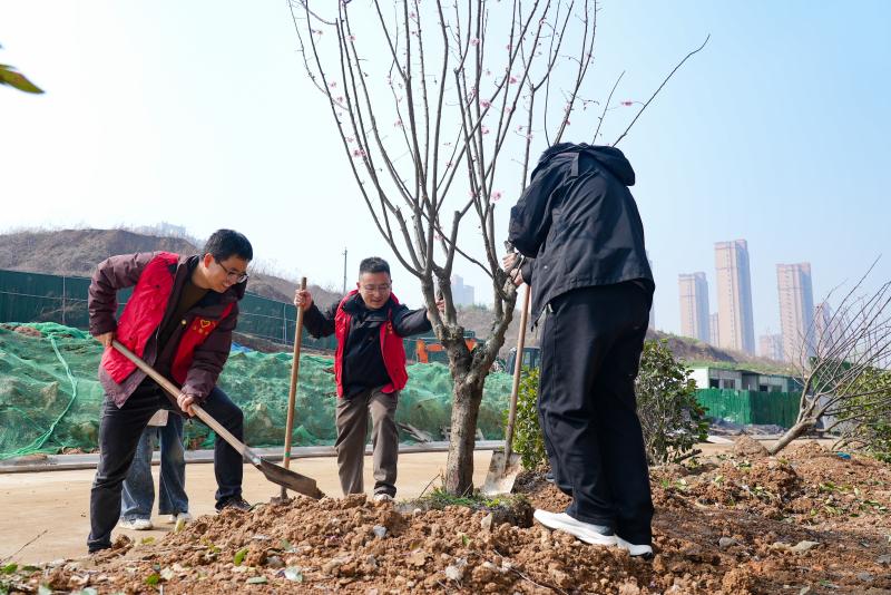 活动现场,党旗迎风招展,党员们分工协作、默契配合,挥锹铲土、扶苗填坑、提水浇灌,每一个环节都一丝不苟,现场呈现出一派热火朝天的劳动景象。经过一番辛勤劳作,一株株新栽种的树苗迎风挺立,焕发出勃勃生机,为初春的大地增添了丝丝绿意。