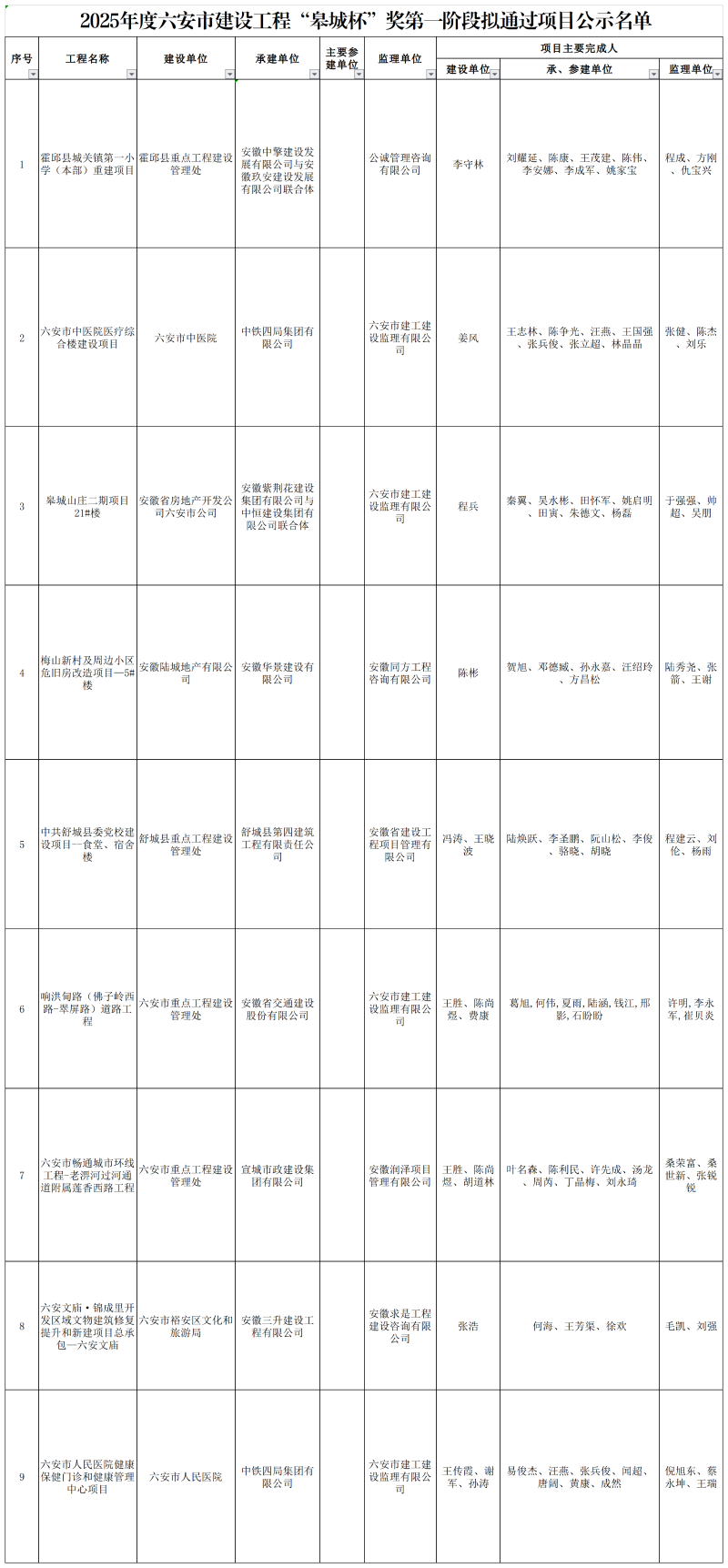 关于2025年度六安市建设工程“皋城杯”奖第一阶段拟通过项目名单的公示