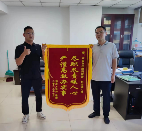 "尽职尽责暖人心,严谨高效办实事!"7月21日,家住万兴滨江府小区的郑先生将一面锦旗送到市住建局质安处,红绸金字的背后,是住建干部用"铁脚板"踏出的民生温度,用"真担当"写就的服务篇章。